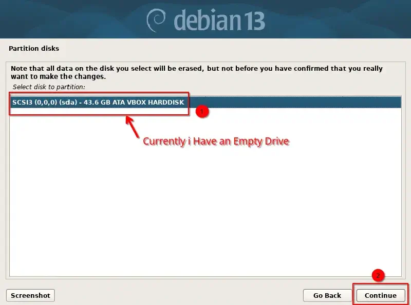 The screenshot below displays the number of hard disks found on your system. Currently, there is only one hard disk for me. Just select and click on continue.