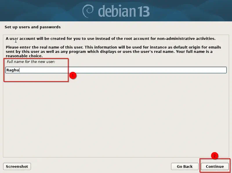 Next, create a non-admin user account. Which will be used regularly all the time. Enter the Full Name of the user.
