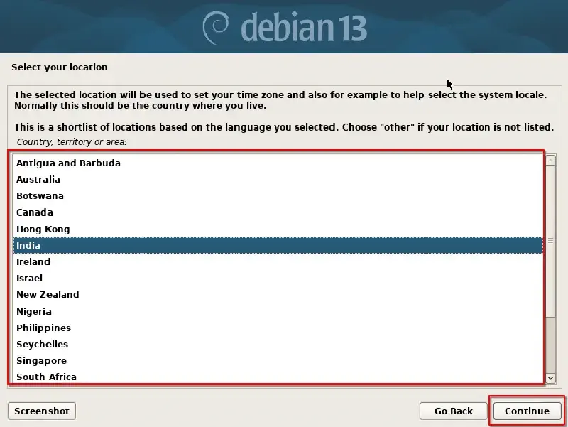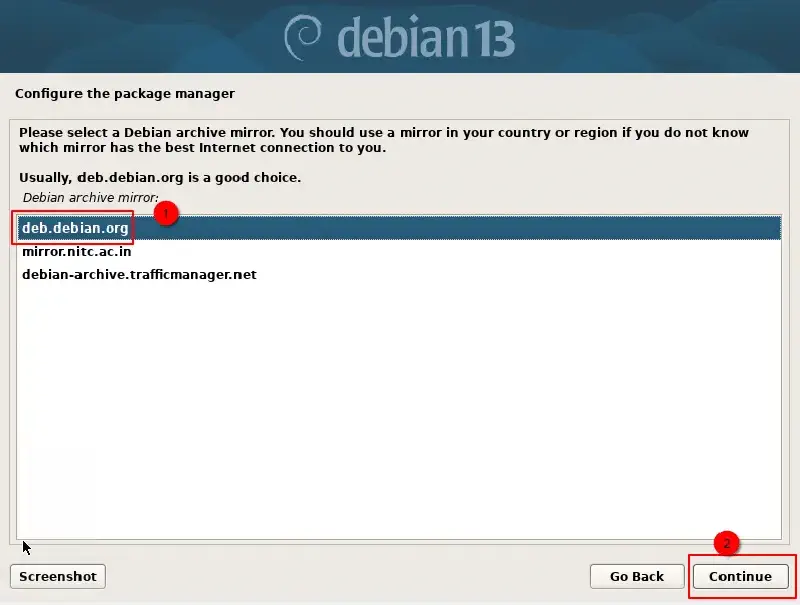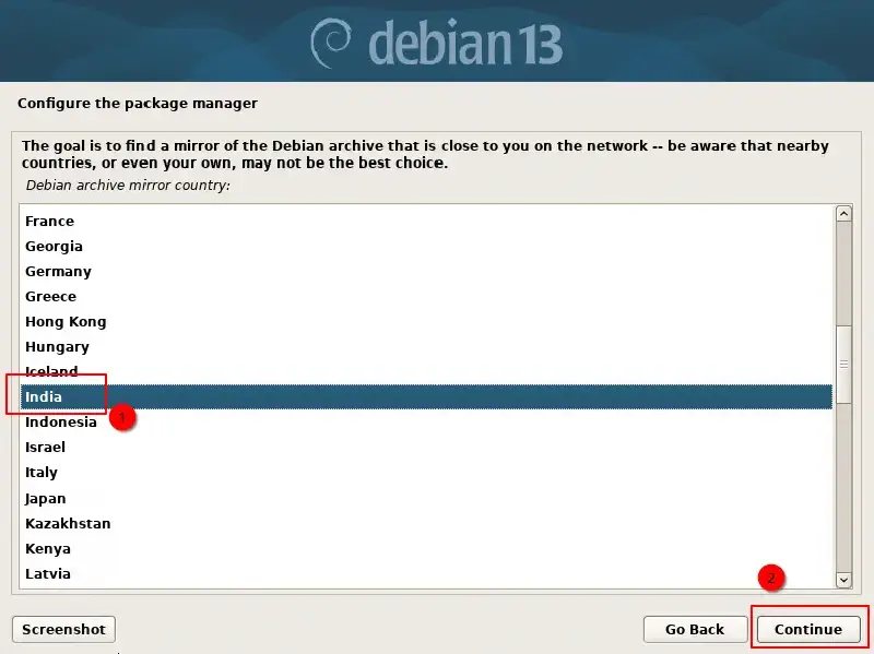 As there are many servers, select your country or a nearby country Debian package repository(mirror). A nearby mirror server helps in faster download speeds. I will select the default recommended.