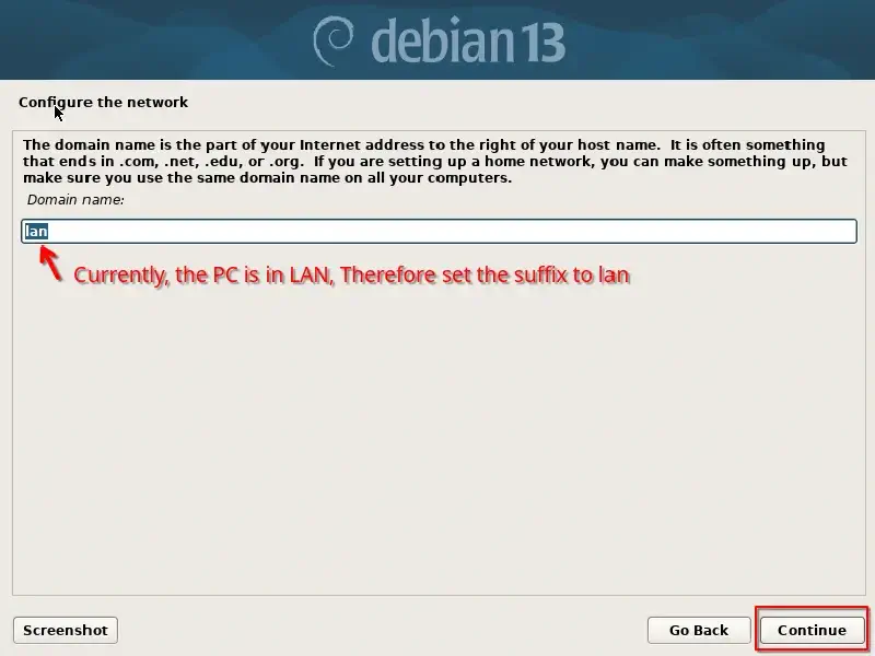 Next followed by, set “domain name”. (It’s optional, leave empty or configure if you have any)