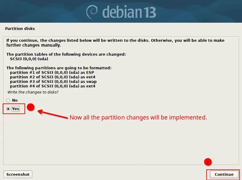Now that all the partition changes have been reviewed, the system will request final confirmation. Clicking on “Yes” will implement all the recommended changes and will continue installing the system core files.