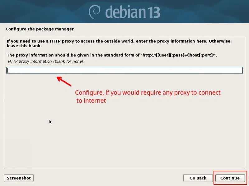 Configure HTTP Proxy, if you need one to connect to the internet. Or leave blank and click “Continue”.