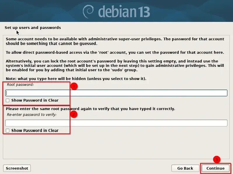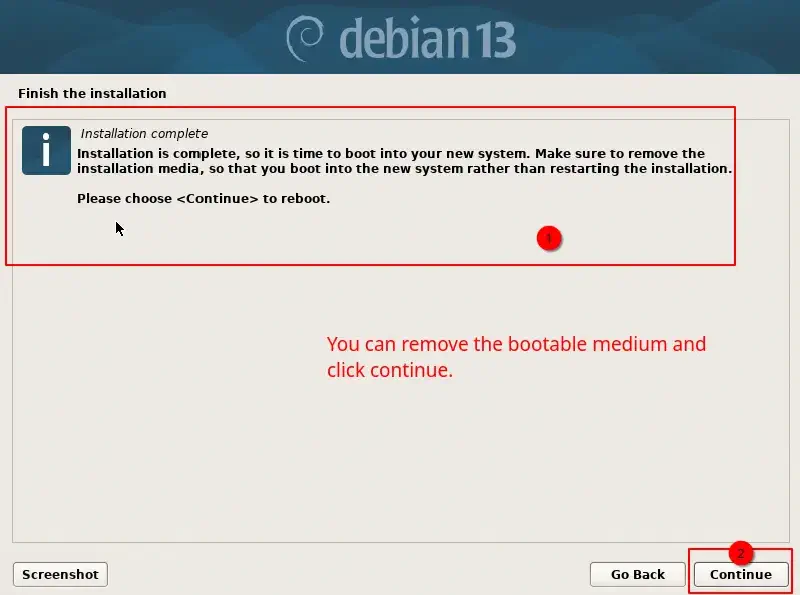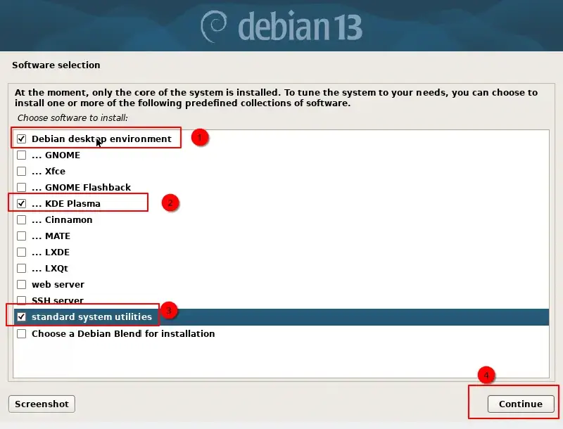 Click “Continue”. This ensures Debian installs KDE Plasma as your desktop (GUI). It will take some time to download and install the packages.