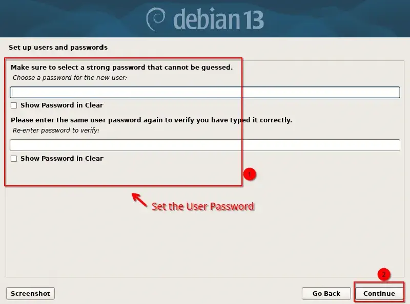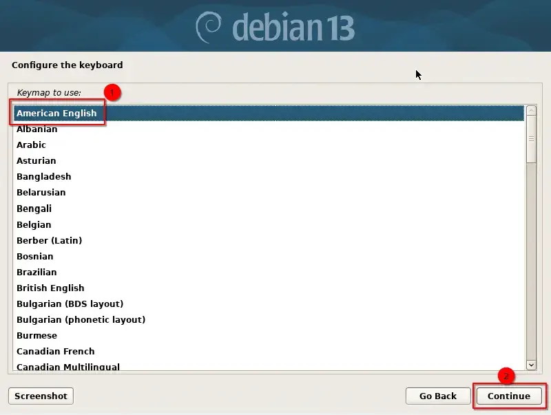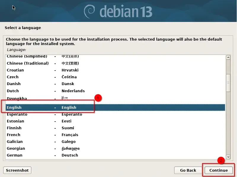 Select the language you want Debian to use during installation and for the system interface. After selecting the language, click on the “Continue” button to proceed next.