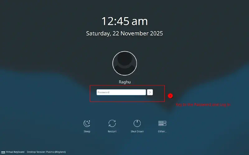 At the login screen, select KDE Plasma (Wayland), enter your password, and log in. You will now see the KDE Plasma desktop.