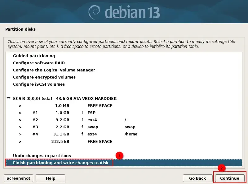 Review the partition summary recommendation. If all seems to match your needs, select “Finish partitioning and write changes to disk”, then click “Continue”.
