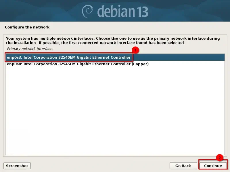 In the current scenario, I am using the Ethernet device “enp0s3”, and after selecting it will trigger the DHCP server to automatically fetch and configure the LAN IP address from the router. Click continue to proceed next.